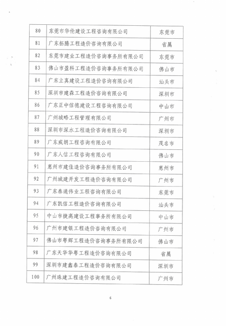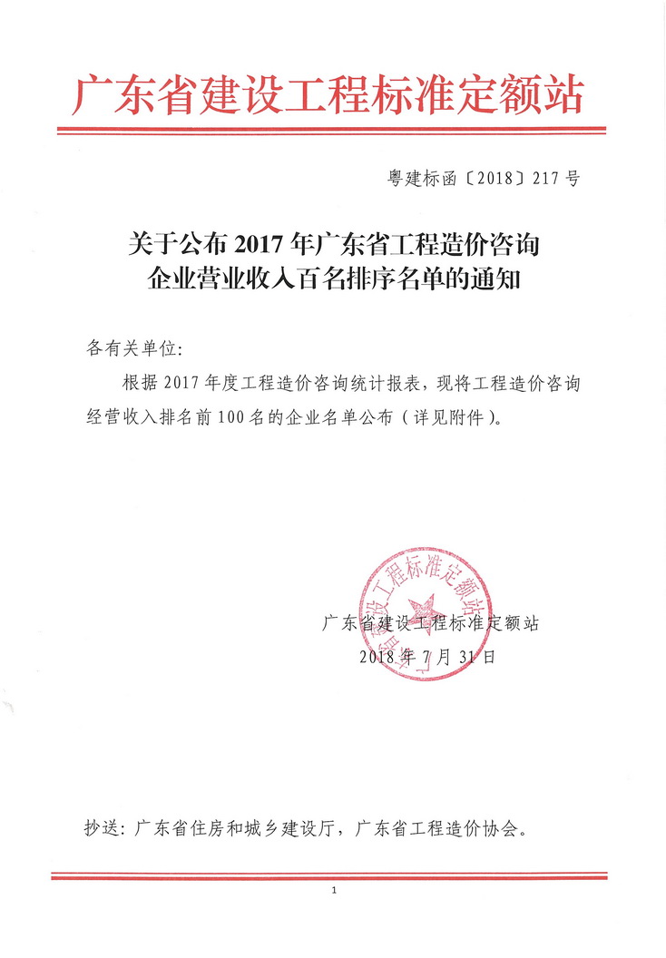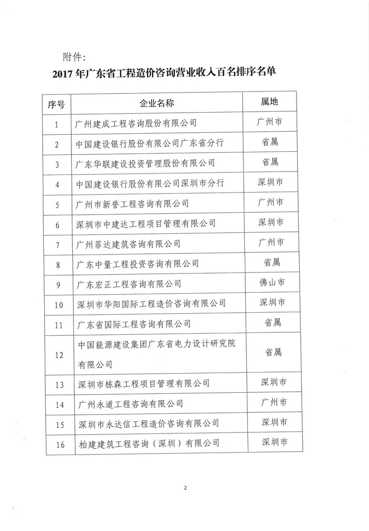 关于公布2017年广东省工程造价咨询企业营业收入百名排序名单的通知