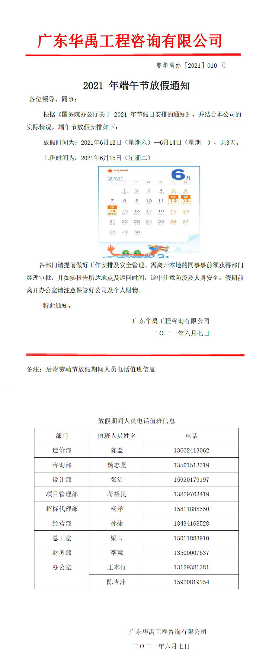 关于2021 年端午节放假通知