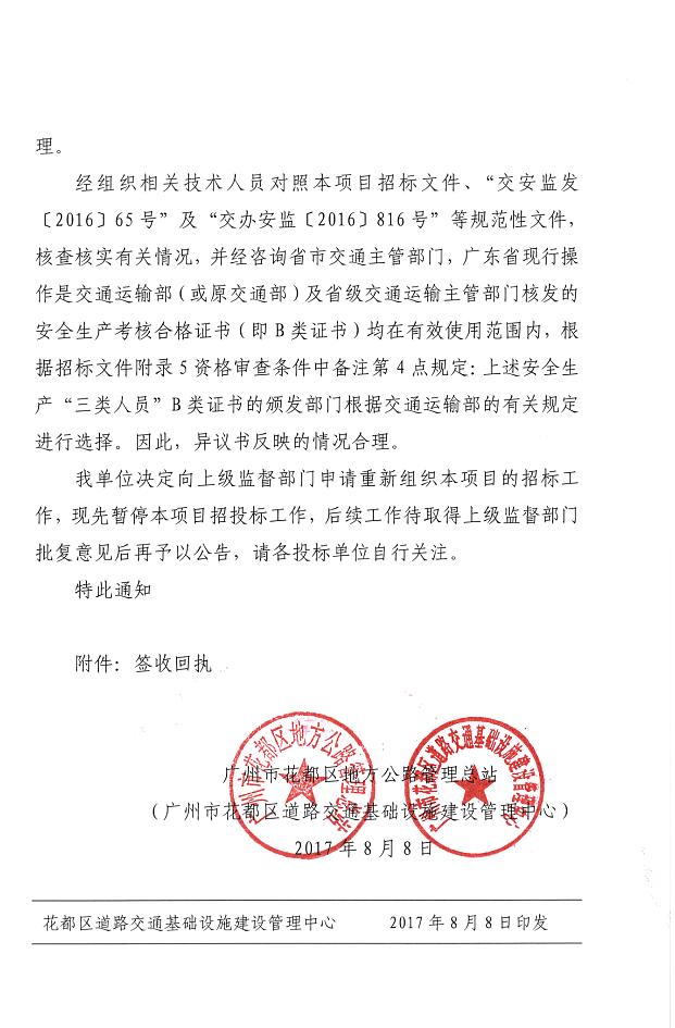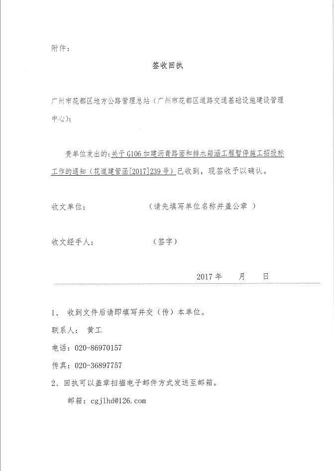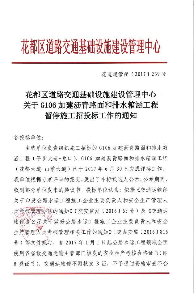 花都区道路交通基础设施建设管理中心关于G106加建沥青路面和排水箱涵工程暂停施工招标工作的通知