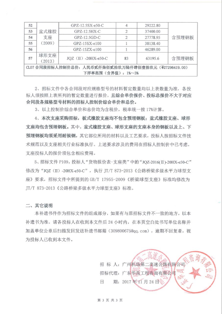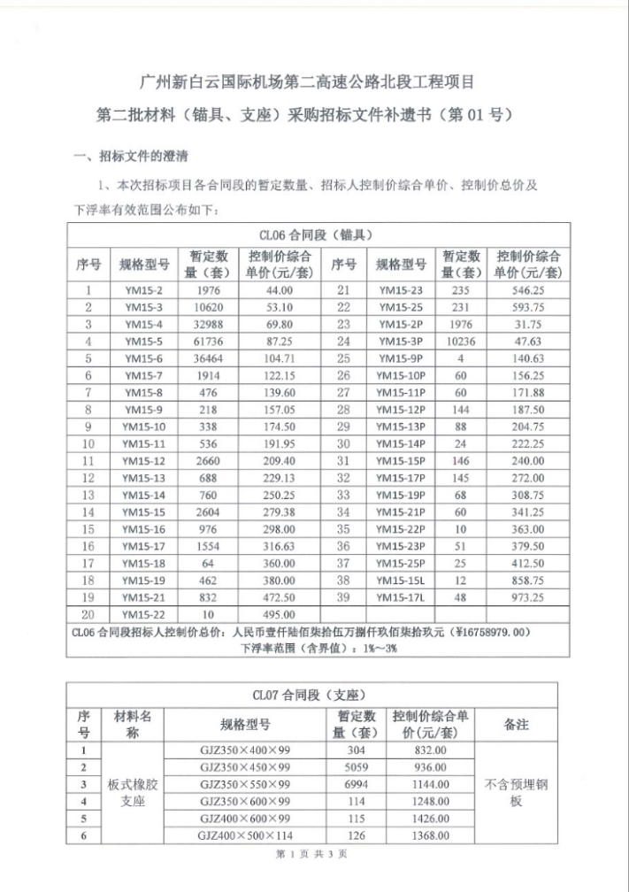 招标通知 - 广州新白云国际机场第二高速公路北段工程项目第二批材料(锚具、支座)采购招标文件补遗书(第01号)