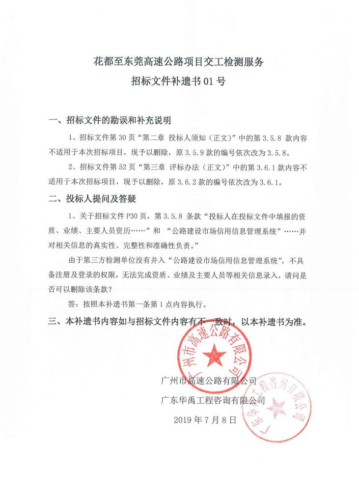 补遗书 - 花都至东莞高速公路项目交工检测服务招标文件补遗书01号