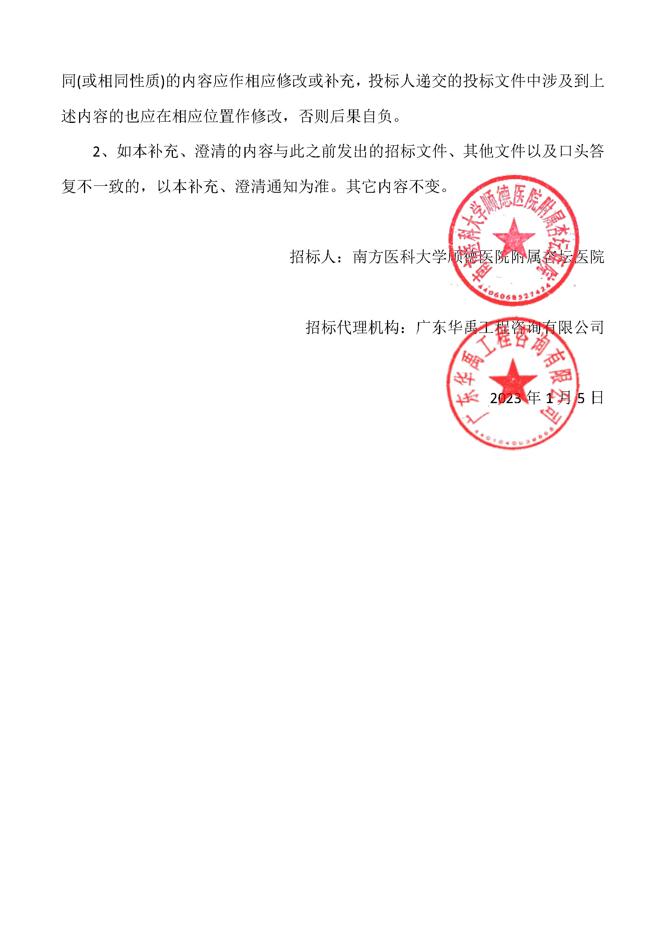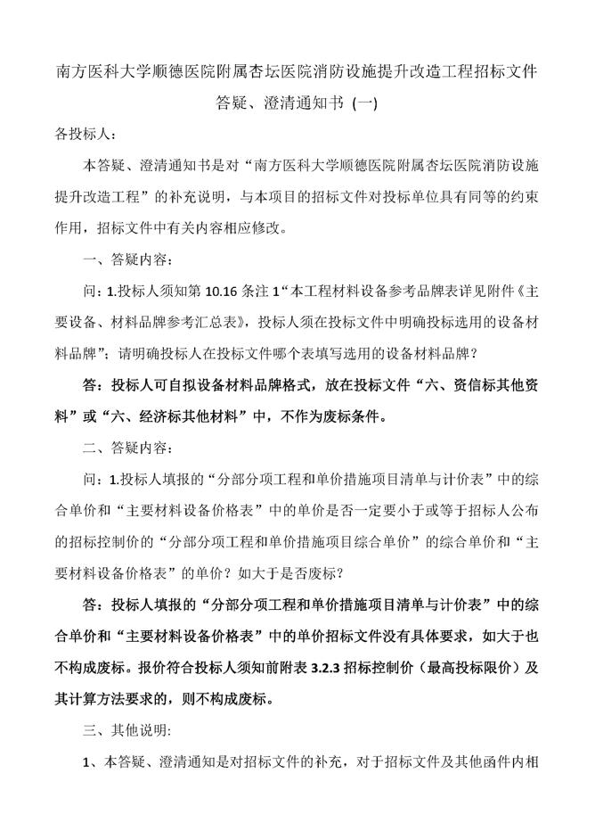 澄清通知书 - 南方医科大学顺德医院附属杏坛医院消防设施提升改造工程招标文件答疑、澄清通知书 (一)